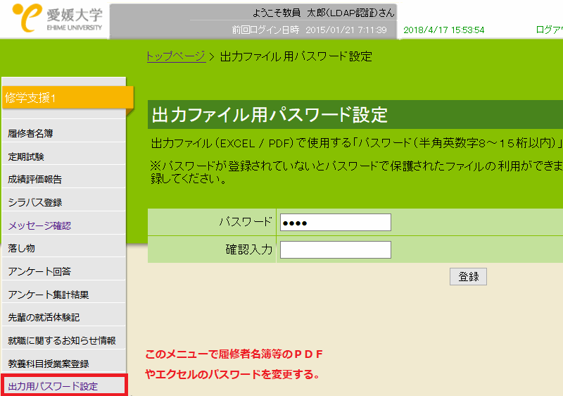 「出力用パスワード」の設定は、ログイン後の左下メニューから行ってください。